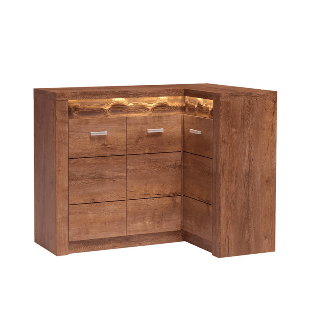 Az INFINITY rusztikus bútorcsalád sarok komód eleme, megjelenése és kihasználhatósága miatt közkedvelt bútordarab. A bútorcsalád elemei nyers festett fa elemekkel, domború mintázattal, háromféle színváltozatban kaphatóak, a keretek anyagvastagsága 48 mm. Színe és formája tökéletesen követi korunk divatirányzatát, ezáltal bármely igényes enteriőrbe könnyen beilleszthető.  LED világítás opcionálisan rendelhető hozzá.