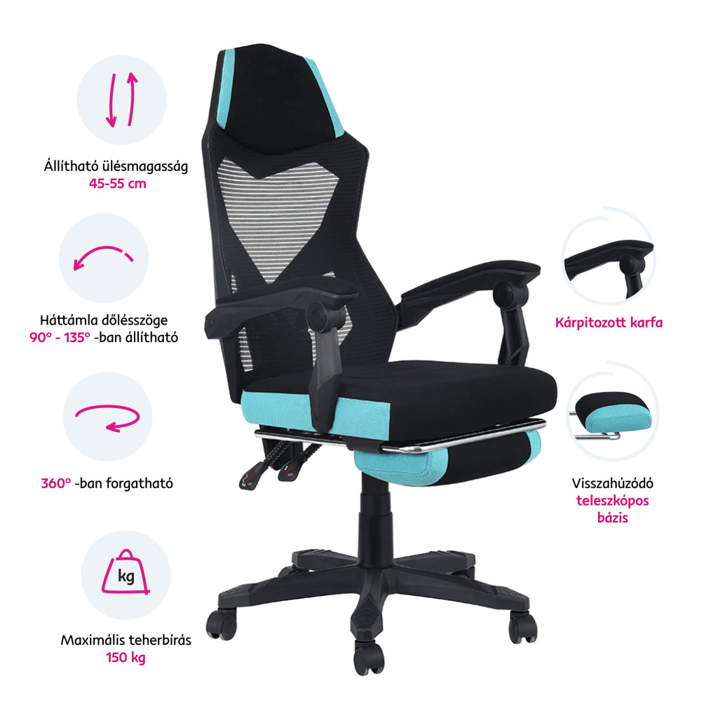 Irodai/gamer szék, fekete/neomint, teherbírás 150 kg, JORIK NEW