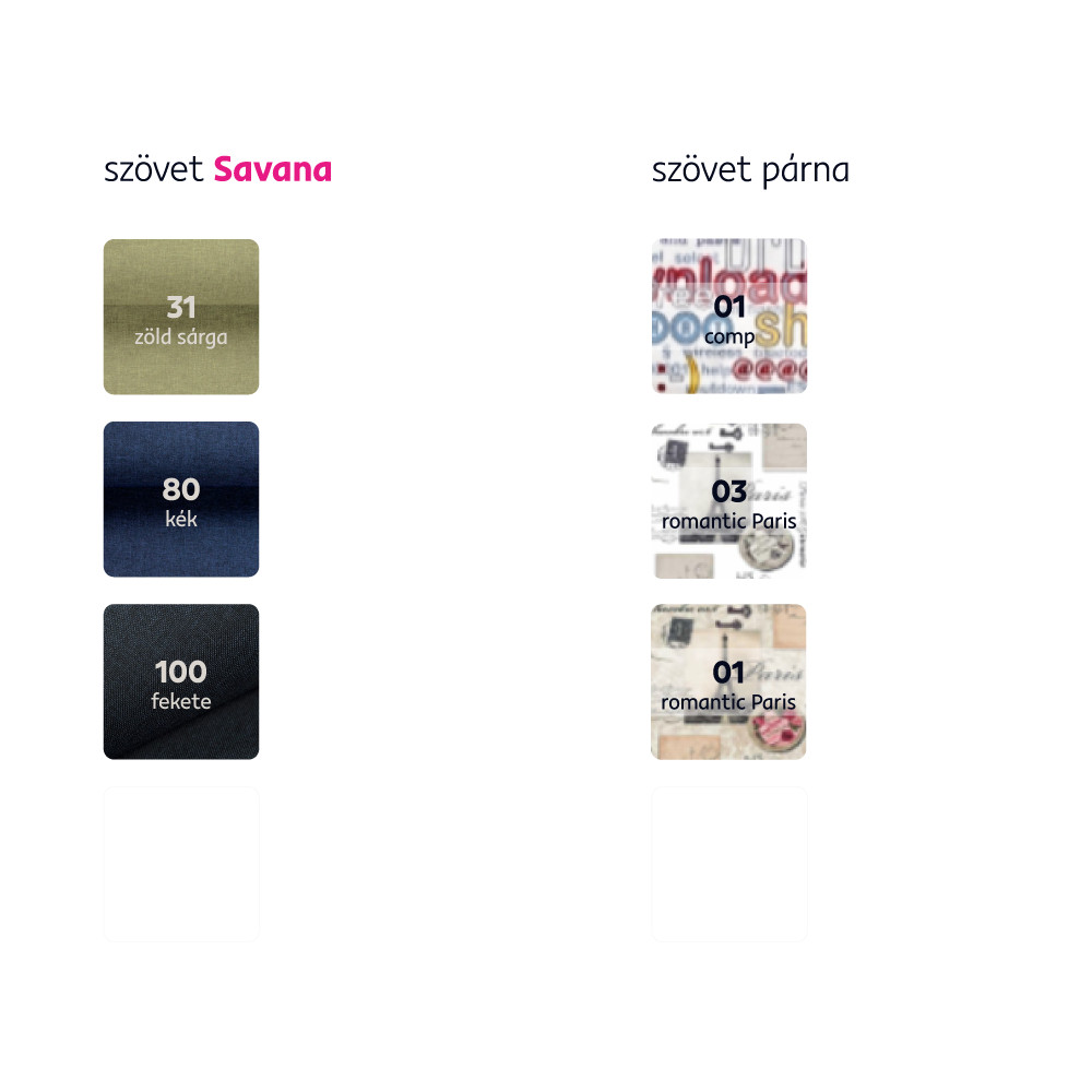 Megrendelhető a Savana szövet 3 színváltozatában és a díszpárna minták kombinálásával. Szállítási idő 14-17 hét. Kérjük az árak után telefonon érdeklődjenek.