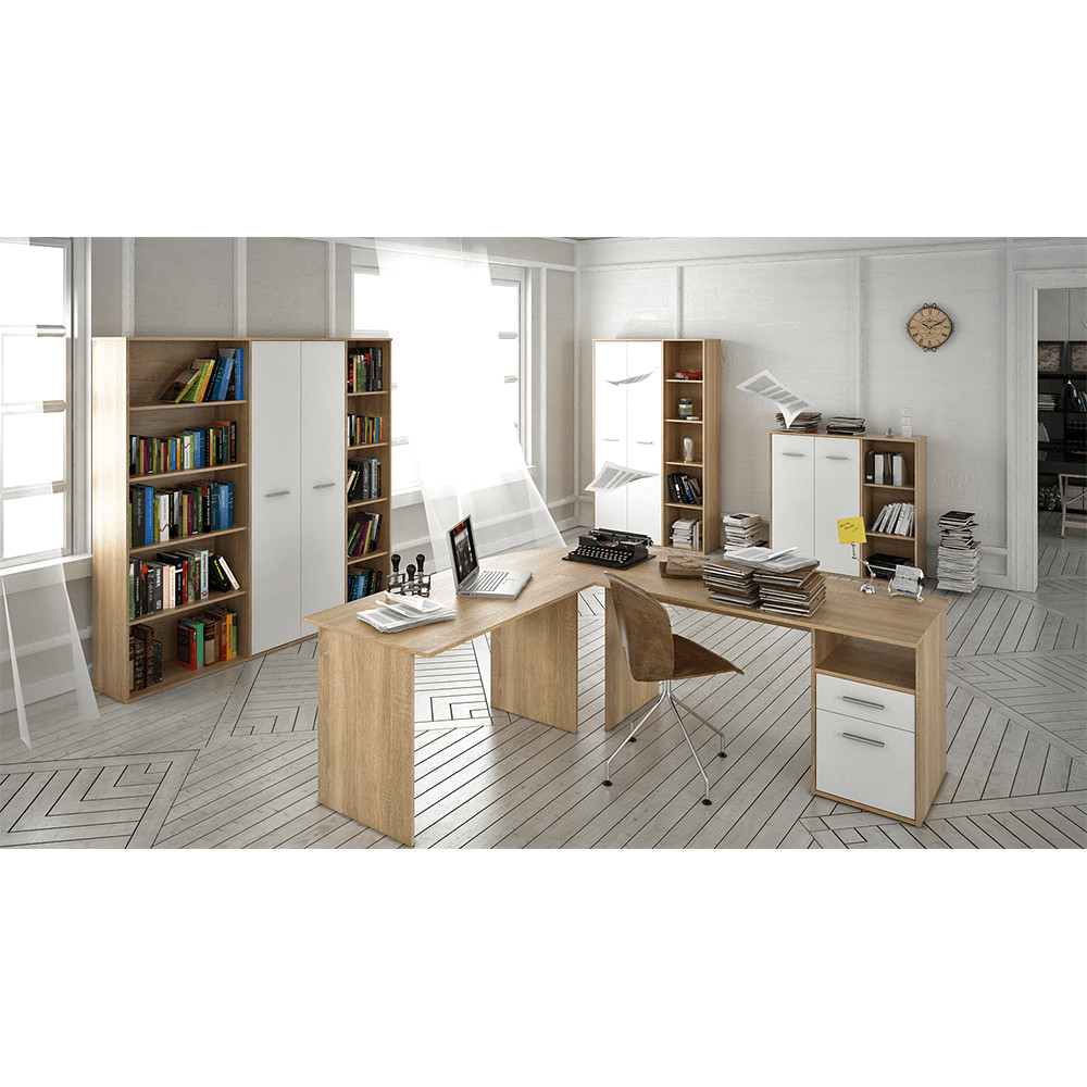 A MAURUS NEW világos sonoma tölgy/fehér színű szekrény, 2 ajtós és 3 nyitott polcos tárolóval, divatos megjelenése és kihasználhatósága miatt közkedvelt bútordarab.