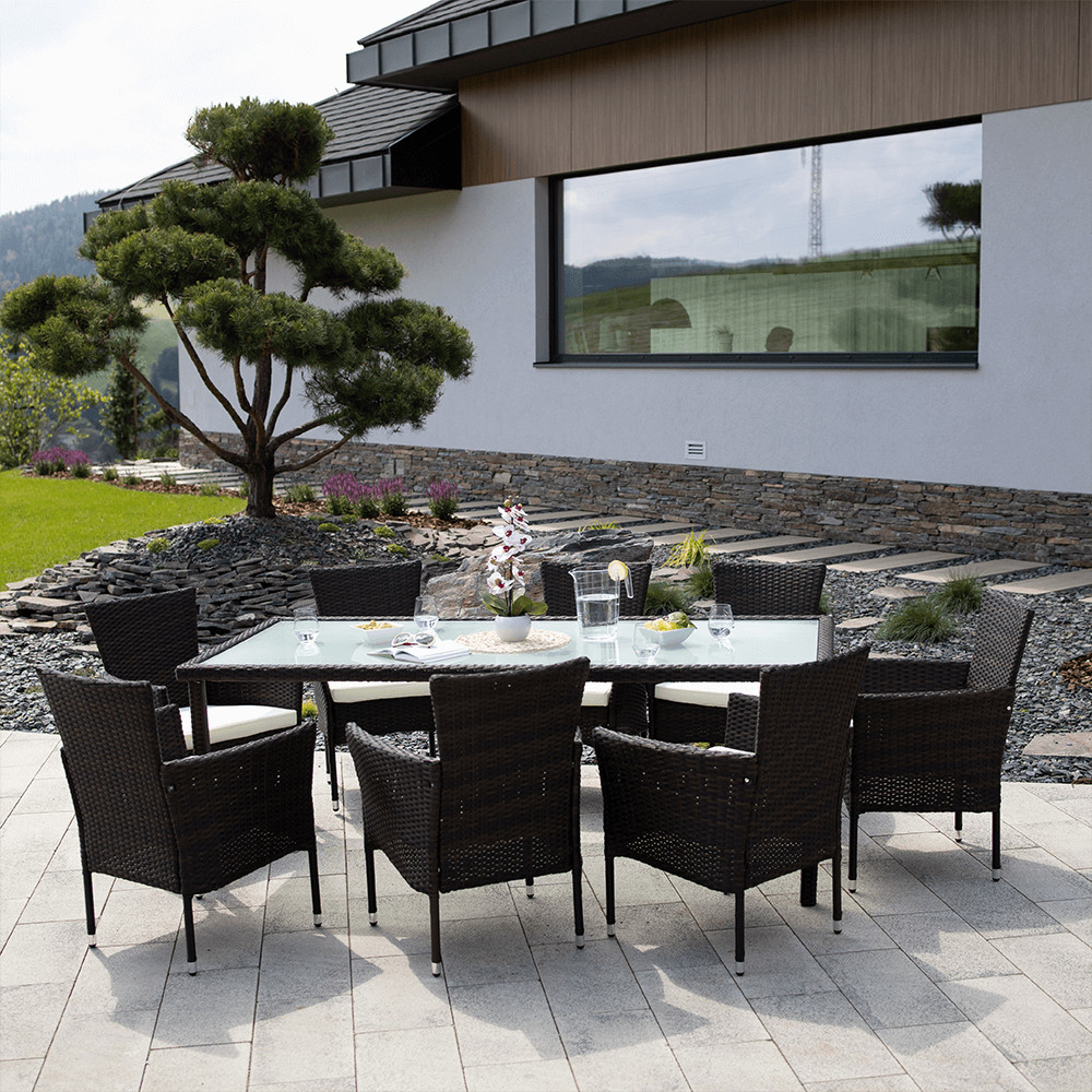 A Menibor 9 részes rattan étkezőszett, egy üveg asztallal és 8 db rattan fotellel. A garnitúra modern stílusa és kihasználhatósága miatt közkedvelt bútordarab.