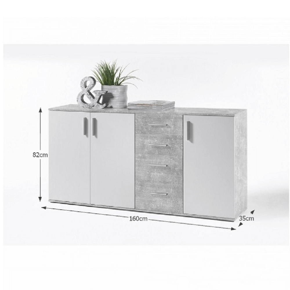A POPPY fehér/beton szürke színű komód, 4 fiókos és 3 ajtós kivitelben, igényes megjelenése és kihasználhatósága miatt közkedvelt bútordarab.