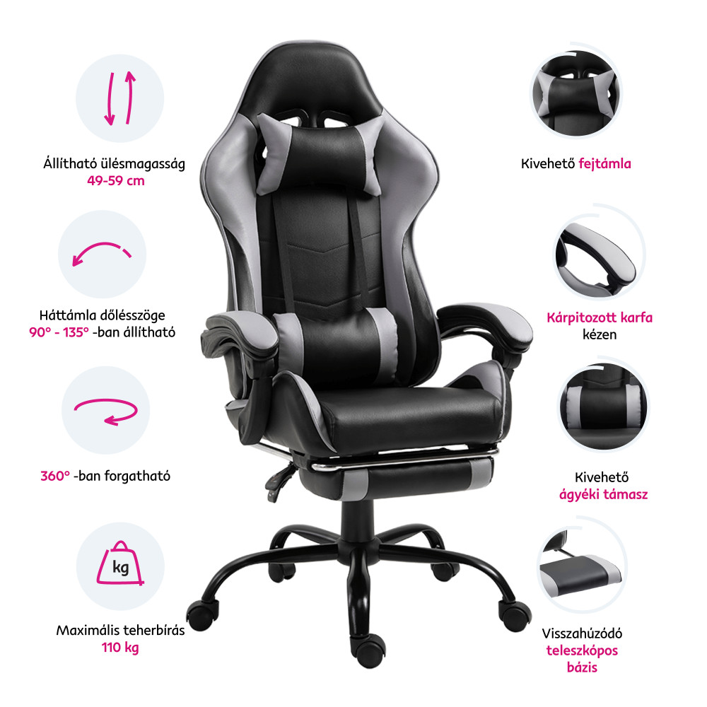 A Tarun irodai vagy gamer szék, kartámasszal és hát-fej párnával valamint hintamechanikával. Behúzható lábtartó biztosítja a kényelmes pihenést.
