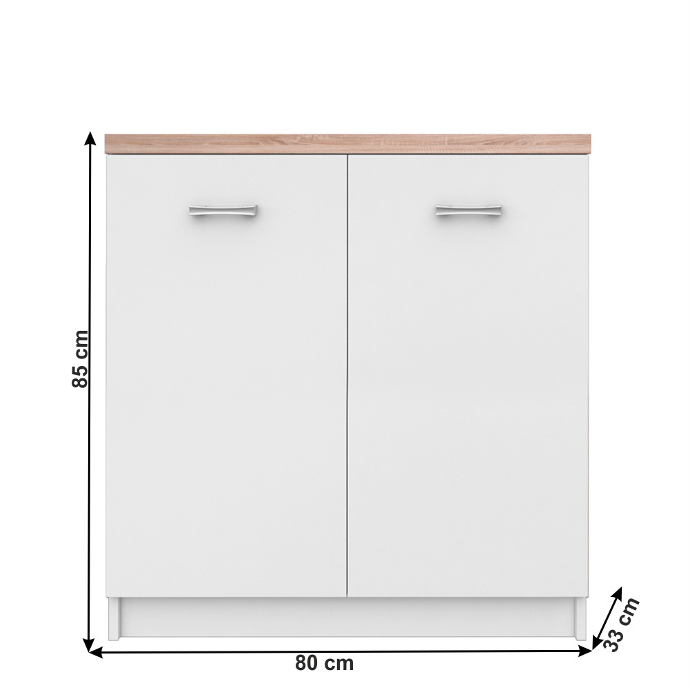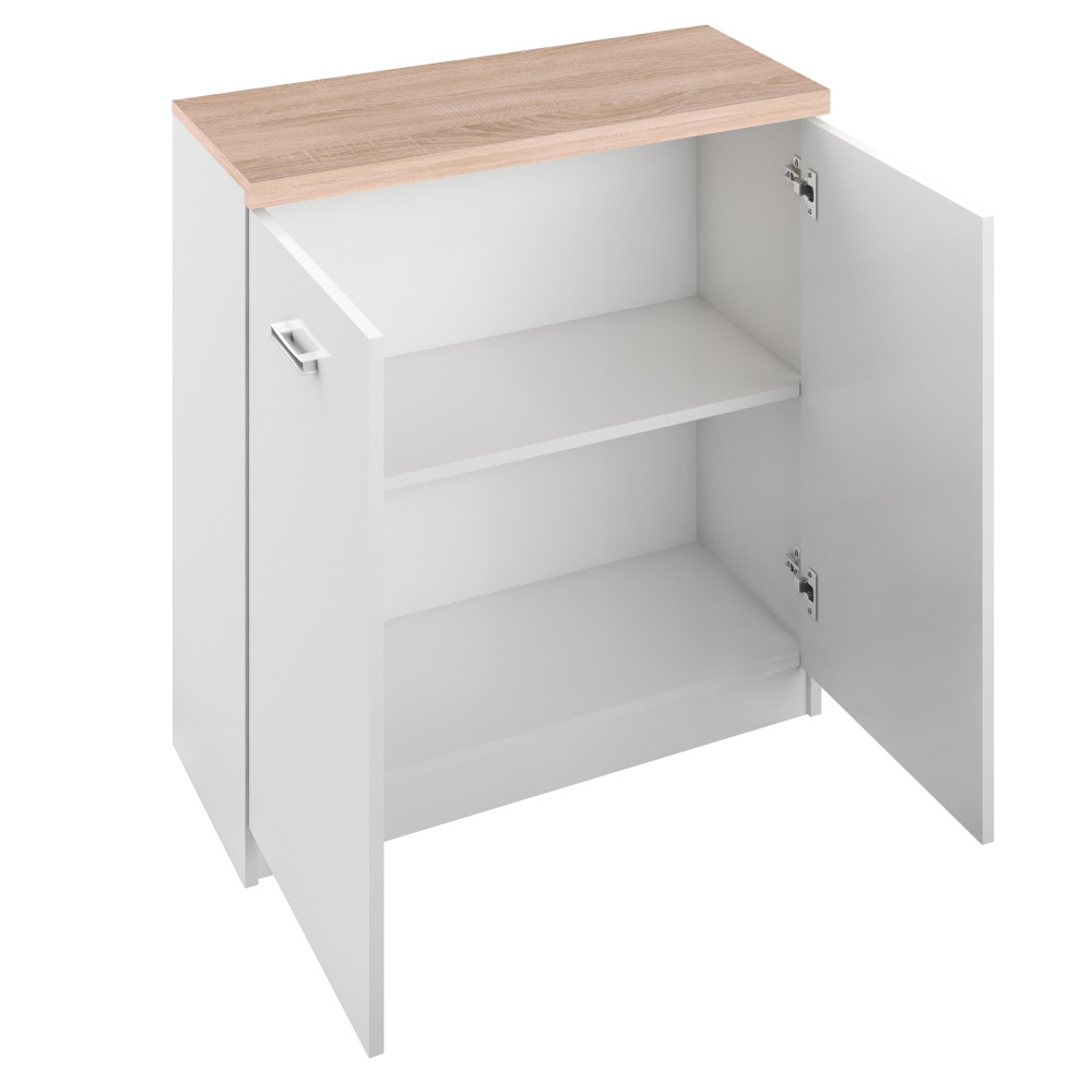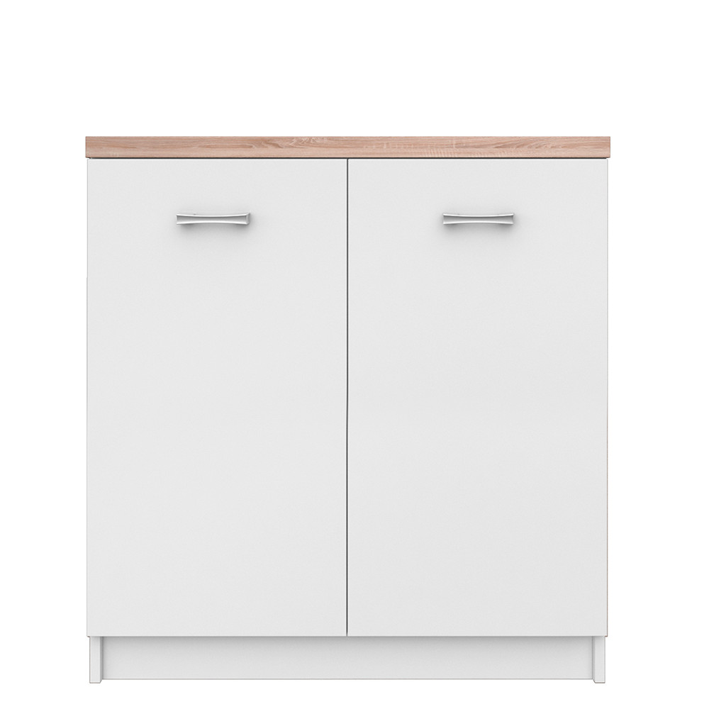 A TOPTY bútorcsalád fehér/sonoma tölgy színű komód eleme, 2 ajtós tárolóval, divatos megjelenése és kihasználhatósága miatt közkedvelt bútordarab.
