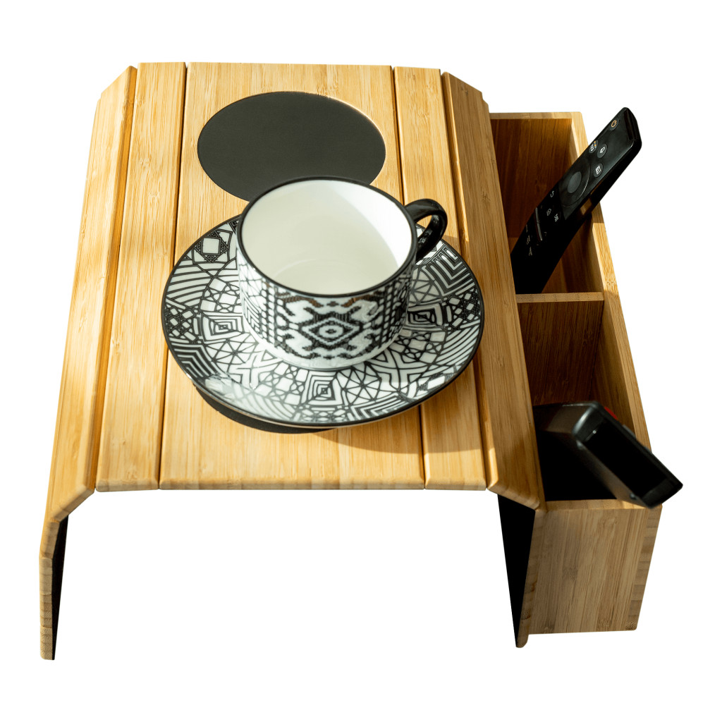 A VISE bambusz tálalótálca kanapék kartámaszához -könnyen összecsukható és mozgatható, kis tárolórésszel,-elegáns stílusa és kihasználhatósága miatt közkedvelt bútordarab.